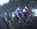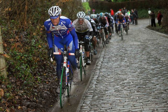 You got that right. The lead picture is a shocker. Ok, so he wants to show off the sponsor logos on his socks (a modern abomination IMHO and the real culprit in the ever heightening sock debate) but if it’s cold enough for full leg warmers, wouldn’t a nice knit overshoe look more pro? Merckx knows these guys must have access to the full range of team gear.