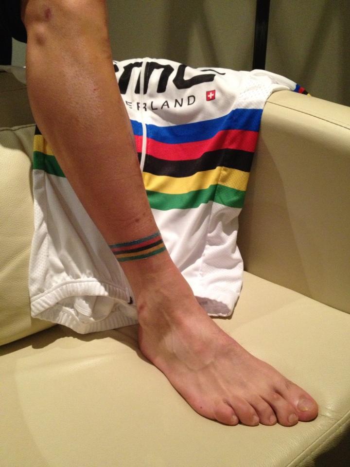 Eh, I don’t know, world championships are usually forever, and tatoos are usually forever, so I think he is within his right. If he gets to put it on his jersey forever, whats the difference? I’m not a rabid fan of ink, but I do think there might be some sort of Rule #9 variant to it. Riding with YOUR world champion stripes tattooed on your leg means you are a badass.