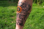 It was during the misty moment that I had my flash of inspiration. The Rules book caught my eye. That cool orange glow got me. I wanted the V and the cog on my leg. However I wanted to take it one rotation further, so the following day I knew I had to follow Rule #81. I went to my fellow cyclist who also happens to be a tattoo artist and set him this challenge. I explained that my legs were my machines for cycling and that I wanted the V and the orange cog incorporated into the design.