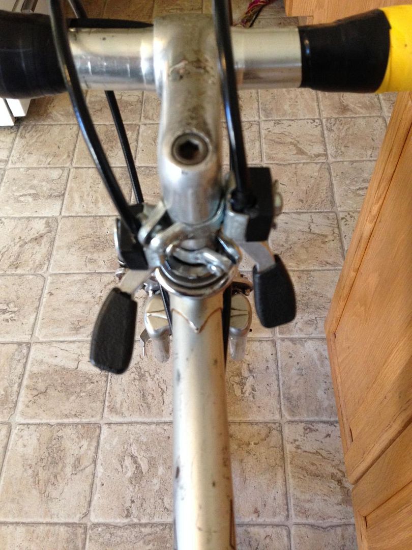 My project for the long weekend was to swap out the flat bar on my wife’s old (3rd, 4th+ hand) bike for drops. In doing, it became clear that I lacked the necessary shifters to accommodate a slightly more robust handlebar. So the old ones got slapped on stem.