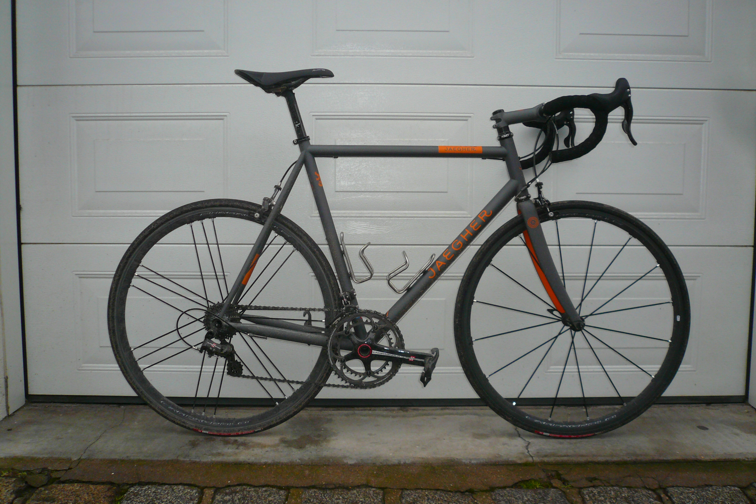 Frame: Jaegher Interceptor, 57cm, Columbus Spirit tubing, Gritty Grey/Jaegher Orange. Columbus carbon fork, carbon steerer.